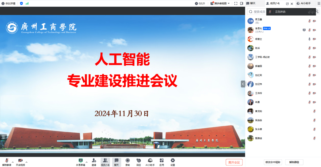 另外,胡院长对专业建设中的任务分配提出具体要求。他强调任务分工要明确到人,避免模糊的责任划分带来实施困难。在谈到学科融合时,胡院长指出,跨学科合作将是人工智能专业发展的核心特色,特别是与冷链物流等领域的结合,将成为学校在人工智能领域的亮点项目。最后,胡院长还提出人工智能专业应积极争取成为一流专业,要尽快启动相关申报工作,以确保专业建设的可持续发展。
