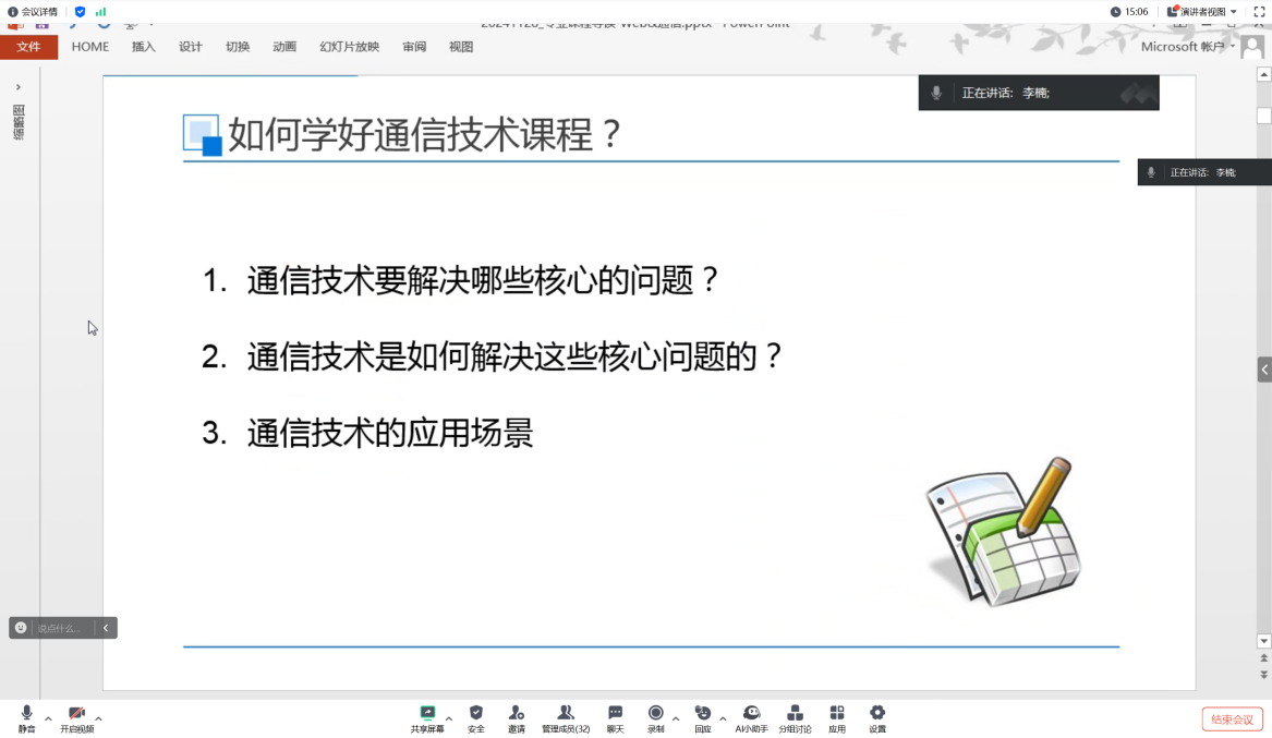 在移动通信部分,李楠老师详细介绍了移动通信技术的发展历程和未来趋势。从早期的电报、电话到如今的5G乃至未来的6G技术,他逐一阐述了各代移动通信技术的特点和应用场景。特别是在5G时代,移动通信技术不仅实现了超高速数据通信,还支持更多设备和数据密集型应用,如虚拟现实、自动驾驶和物联网等。导师指出,随着移动通信技术的不断进步,人们的生活方式和社会经济形态都将发生深刻变革。
