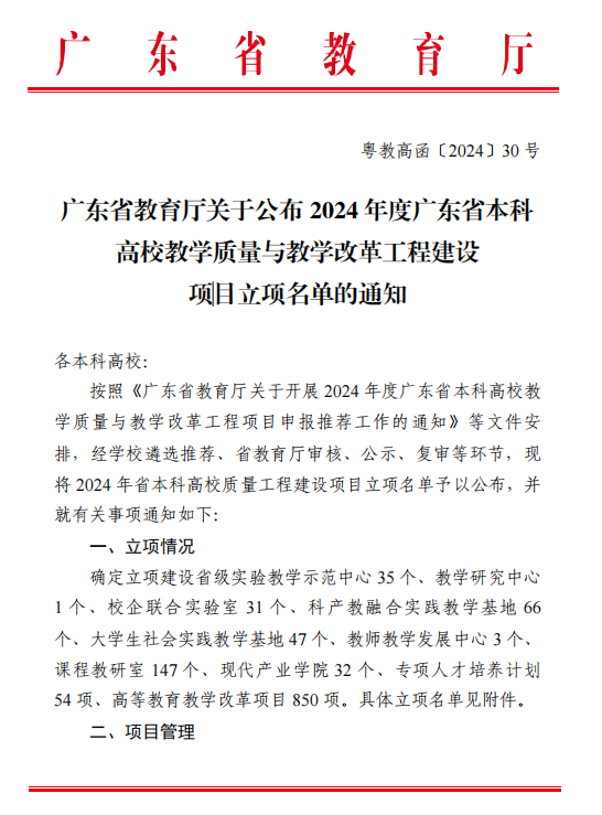 【本网讯】日前省教育厅公布了2024年省级质量工程项立项名单(粤教高函[2024]30号),工学院申报的2个项目位列其中。院长张永平教授牵头申报的“数智技术产业学院”成功立项,这是beat365获批的第2个省级现代产业学院。同时,学院宋钰老师申报的高等教育改革项目也获批立项。