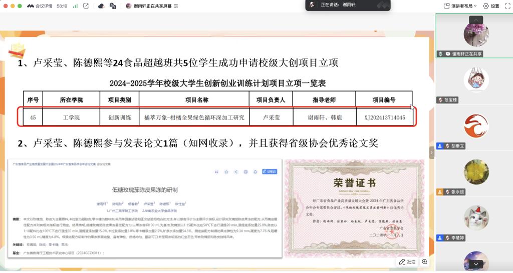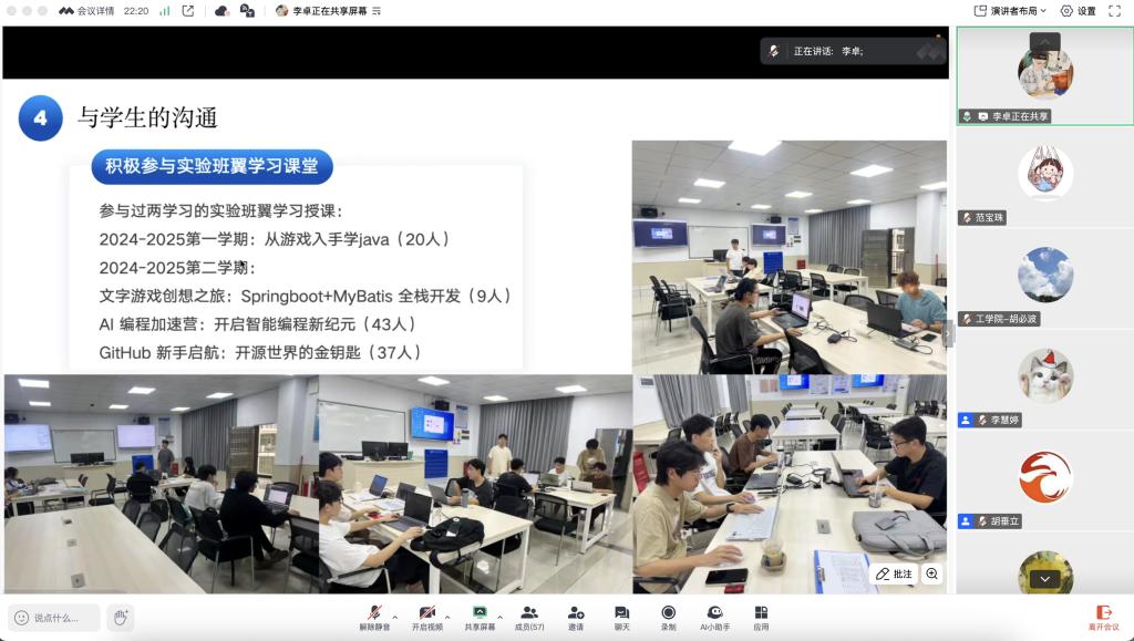 本次分享会由工学院胡垂立副院长主持,五位导师依次发言。李卓老师以“与学生一起乘风破浪”为主题,分享了他带学生的四大经验:鼓励式教育、不放弃任何一名学生、启发学生自主思考和鼓励学生积极参加活动。在他的悉心指导下,两名学生荣获蓝桥杯广东省三等奖,成功开展两个大创项目并发表多篇论文。他强调,作为学业导师,要与学生建立良好的师生关系,相互学习,共同成长。