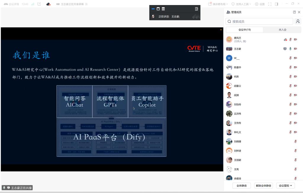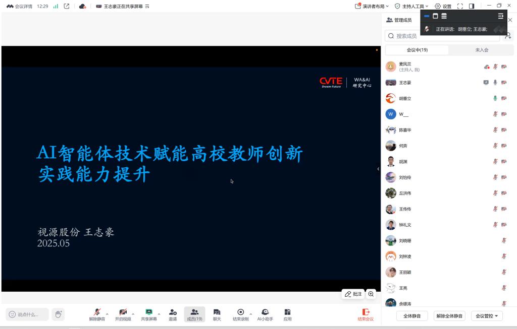 【本网讯】为探索人工智能技术与教育实践的深度融合路径,推动高校教师在智能时代的创新实践能力提升,5月28日晚,工学院特别邀请视源股份集团AI研究员王志豪工程师分享企业AI技术落地经验,举办了一场以“AI智能体技术赋能高校教师创新实践能力”为主题的线上研讨会。会议由工学院胡垂立副院长主持,工学院专任教师积极参与,共同探讨人工智能技术在实践场景中的创新应用。
