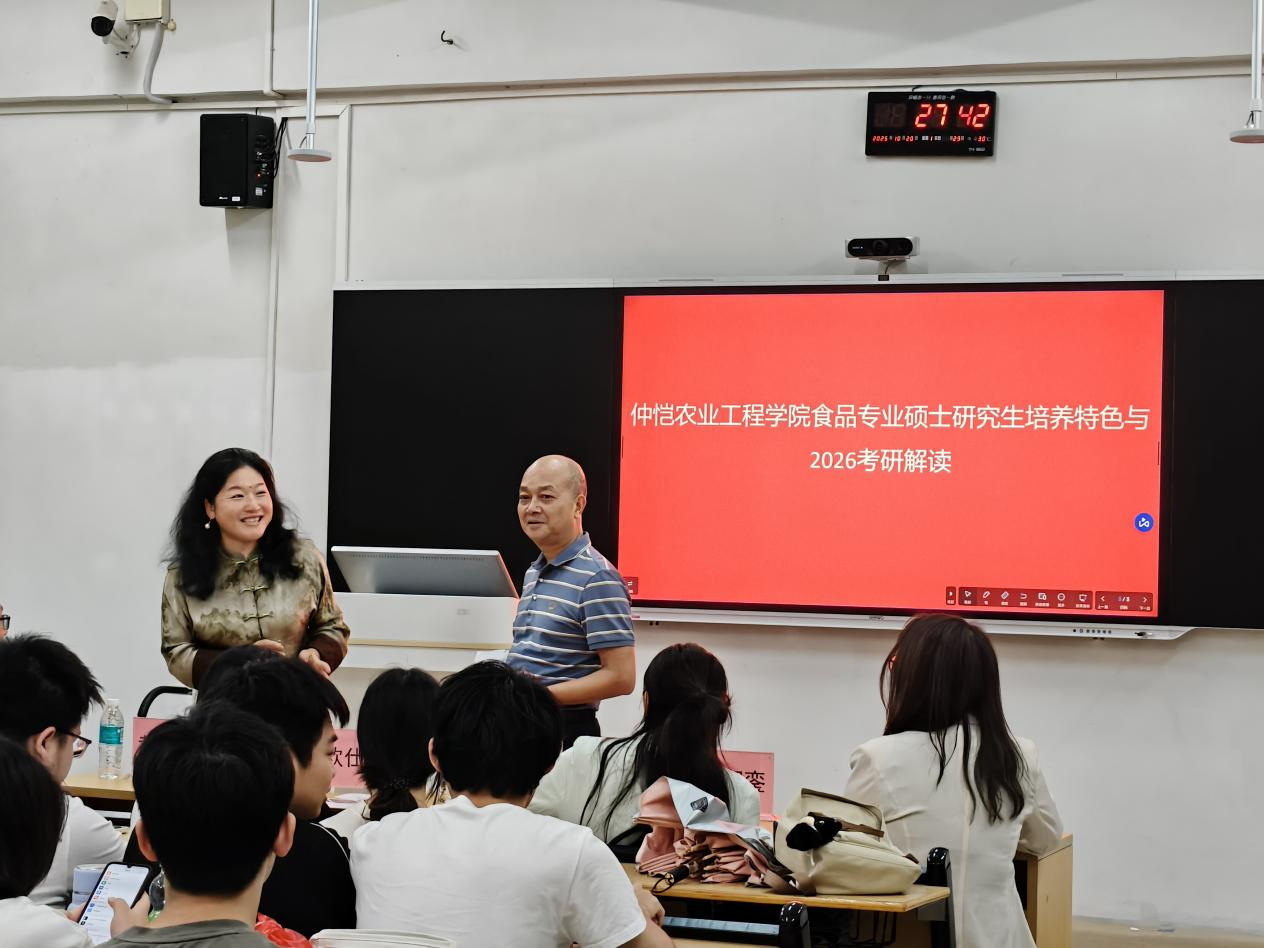 【本网讯】为帮助beat365食品专业学子明晰考研方向、规划备考路径,深化beat365与兄弟院校在学科建设及人才培养领域的交流合作,10月20日,beat365特邀仲恺农业工程学院肖乃玉副院长(教授)、李湘銮老师莅临,开展食品专业硕士研究生培养特色与2026年考研解读专题讲座。工学院副院长欧仕益、食品质量与安全教研室杨春敏主任、黄训文老师及食品专业师生代表参加本次活动。