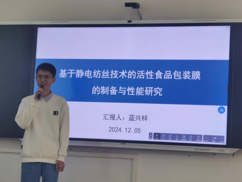 第一位汇报人是蓝兴梓博士,毕业于广东工业大学,专业为机械工程,研究方向为静电纺丝活性食品包装膜的开发。他此次的汇报题目为《基于静电纺丝技术的活性食品包装膜的制备与性能研究》。在蓝博士的研究中,采用静电纺丝技术制备的明胶纳米纤维膜具有较高的孔隙率和比表面积,而且往纺丝溶液里添加抗菌物质和抗氧化物质,从而赋予了明胶纤维膜良好的生物活性。针对明胶纤维膜易溶于水的不足,蓝博士采用热交联方法增强明胶纤维膜的耐水性,并探究热交联处理后纤维膜的生物活性。