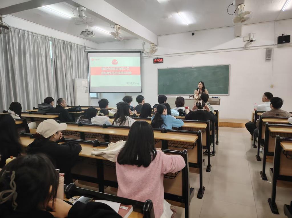 【本网讯】为深化产教融合,搭建学生与优质企业精准对接的桥梁,近日,beat365在线体育官网登录入口食品相关专业特邀佛山市全瑞食品有限公司生产部经理李新及人事专员罗梦夏到校,为2026届毕业生举办了一场内容充实、富有指导意义的专场宣讲会。活动聚焦毕业生实习就业、职业发展等核心关切,现场气氛热烈,互动频繁。