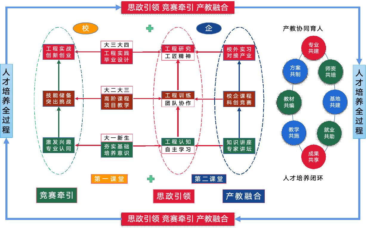 通信工程秉承“思政引领,竞赛牵引,产教融合”的人才培养思路;坚持校企协同共育,以学生为中心;以能力培养和价值塑造为目标,以“课程思政”为指导,以“学科竞赛”为抓手,以“产教融合”为助力,实践“创新探索、问题导向、以生为本”、“以赛带课、以课带学、以赛带练、以学助赛”应用型人才培养方式。如下图所示。