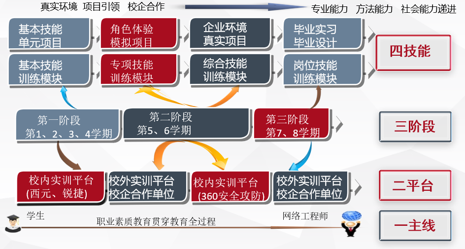 网络工程专业采用一主线、二平台、三阶段、四技能的人才培养架构,围绕将学生培养为网络工程师、云计算工程师、网络安全工程师这一主线,在校内实训平台和校外实训基地两大平台支撑下,将整个四年课程教学分为三个阶段,课程主要培养学生基本能力、专项能力、综合能力、岗位能力的四技能递进,如下图所示。