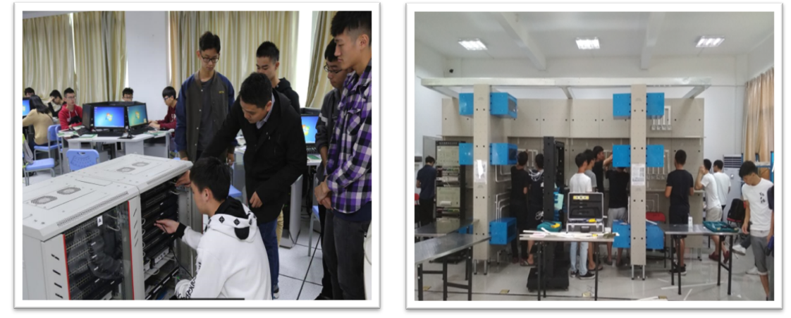 网络工程实践校内教学基地主要包括360网络安全实训室、 网络综合应用实训室、 网络综合布线实训室等多间实训室,实训设备资产622万元。实验设备先进,功能齐全,满足应用型本科教学科研需要。实践教学基地主要承担《网络安全》《路由与交换技术》《网络综合布线》《网站建设与规划》《虚拟化与云计算》《数据库原理与应用》《Linux操作系统》等20多门专业必修和选修课程的实践教学任务。