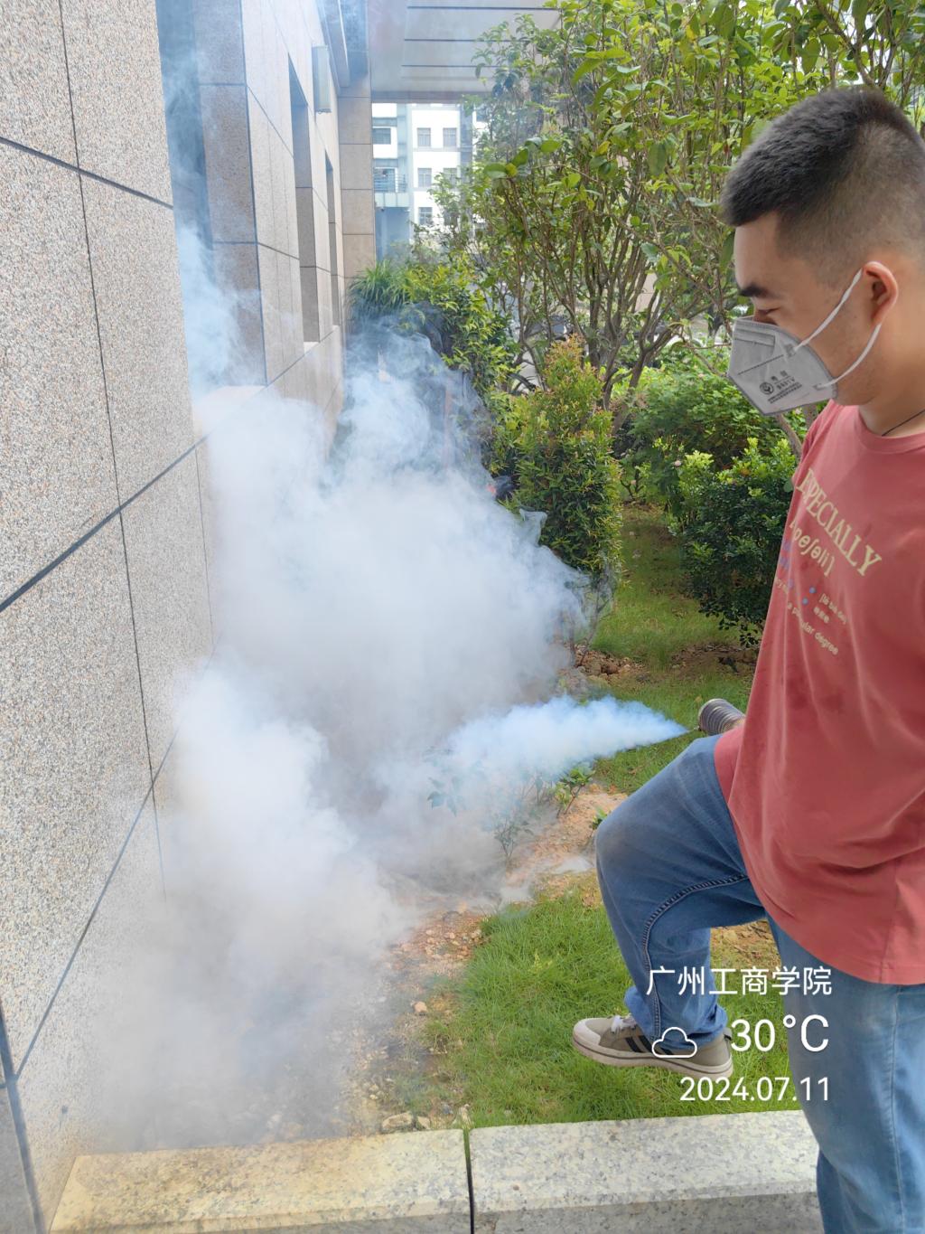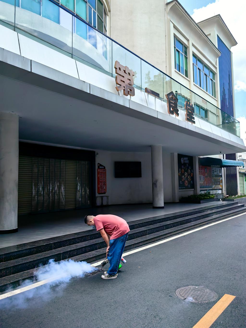 二是采用喷雾机药物消杀的方法,外请专业人员对污水管道、垃圾处理站、食堂周边、各栋大楼前后及角落进行全面消杀。