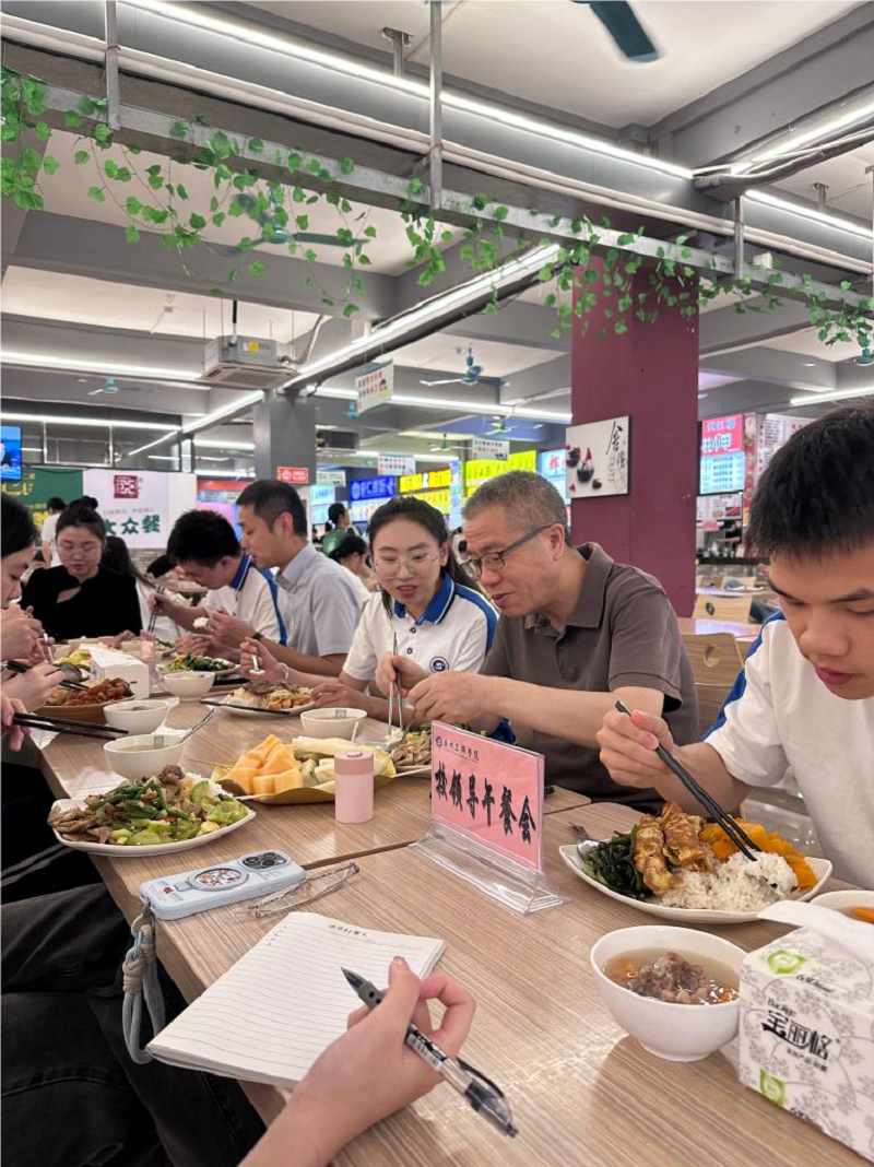 为切实保障师生用餐安全与营养健康,进一步加强食堂管理,2025年5月20日,学校在花都校区第二饭堂一楼举办了第十二期“校领导午餐会”。学校副校长汪前元教授与来自各学院的6位师生代表共进午餐。后勤处、学生处、学校食品安全员、食堂负责人、食堂食品安全总监、校团委代表一同参加活动。