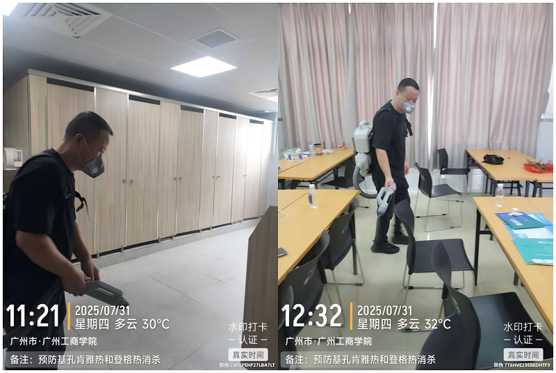 4.蚊媒传染病预防:结合当前季节特点及流行病防控要求,本次消杀特别加强了对各类积水容器的清理力度,如废弃器皿、排水沟等,彻底清除蚊虫孳生地。同时采用超低容量空间喷洒与滞留喷洒结合的方式,对学生公寓、教室、公共区域绿植、灌木丛、下水道等区域进行深度消杀,消除伊蚊幼虫孳生环境,最大限度降低蚊媒密度,切断基孔肯雅热、登革热等疾病的传播途径。