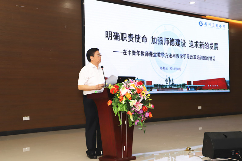 在开班仪式上,校长邝邦洪教授作了“明确职责使命 加强师德建设 追求新的发展”为题的动员报告。他首先介绍了学校的基本情况、指导思想和定位,并对教师明确职责使命,加强师德建设提出了要求。他指出,一是要认真学习习近平总书记重要讲话精神,加强师德修养,做学生欢迎的好老师;二是要积极践行教师职业道德规范,爱岗敬业,教书育人,强调要认真学习5月2日习近平总书记在北京大学师生座谈会上的讲话精神。