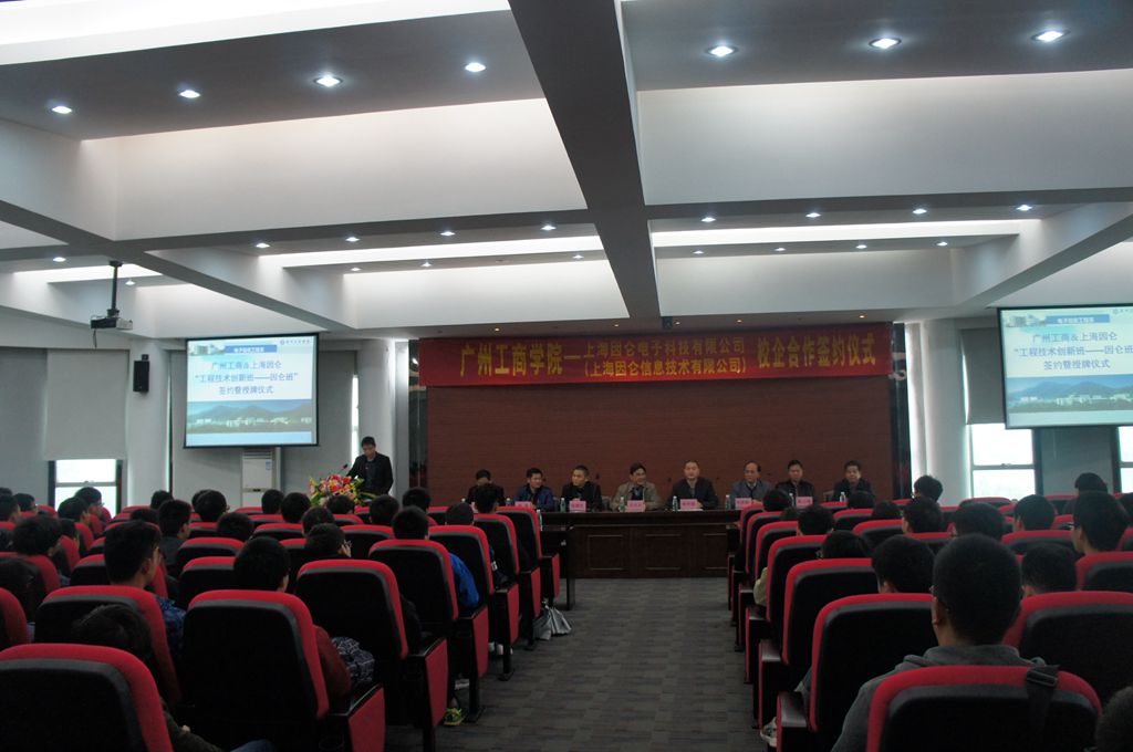 【本网讯】3月18日上午,广州工商&上海因仑“工程技术创新班——因仑班”签约暨授牌仪式在我院三水校区学术报告厅隆重举行。出席本次活动的嘉宾和领导有上海因仑信息技术公司执行总监韩学能、广州银证信息科技有限公司总经理张群红,学院副院长吴宏岳,三水校区管委会、科研处兼校企办、实验实训中心、电子信息工程系主要负责人。大会由电子信息工程系副主任易亚军主持。