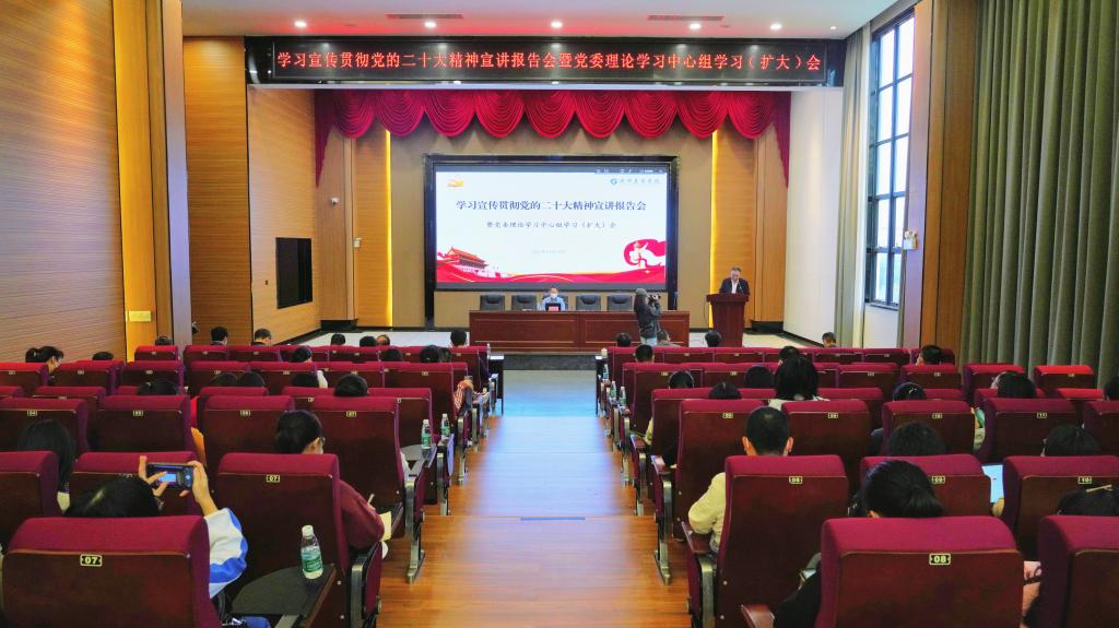 【本网讯】11月25日下午,beat365在线体育官网登录入口召开学习宣传贯彻党的二十大精神报告会暨党委理论学习中心组学习会。广东省委教育工委学习贯彻党的二十大精神宣讲团成员、广东外语外贸大学谢迪斌教授作宣讲报告。学校领导班子成员、两委委员、基层党组织书记、党员师生代表共130余人参加。报告会由校党委书记张振超主持。
