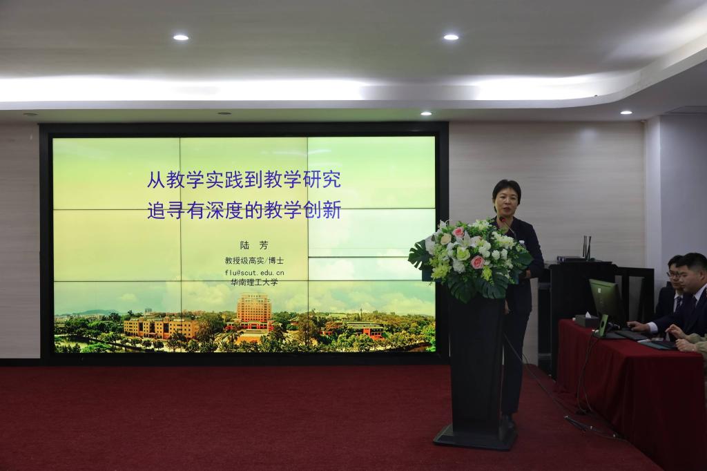 会议进入到主旨报告阶段。首先由广东省高等教育学会教育技术专业委员会的副秘书长、广东省本科高校在线开放课程教职委委员、华南理工大学陆芳教授进行了题目为“从教学实践到教学研究:追寻有深度的教学创新”的教学指导。在指导中,陆教授先提出了,在课程建设中,以坚持质量为本,把好政治学术质量关的前提下,产教融合工作的建设是重中之重的观点。随后,陆教授就在应用型大学当中,如何从教学的实践走向教学研究走向有深度的教学创新进行了讲述。