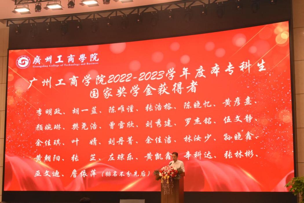 学生工作部部长徐达宣读了表彰决定,对2022-2023学年度获得本专科生国家奖学金的同学们进行表彰。在热烈的掌声中,获奖代表们逐一上台。朱特威为获奖者颁奖。同学们脸上洋溢着喜悦与自豪,展现了广工商学子的卓越风采与昂扬向上的精神风貌。
