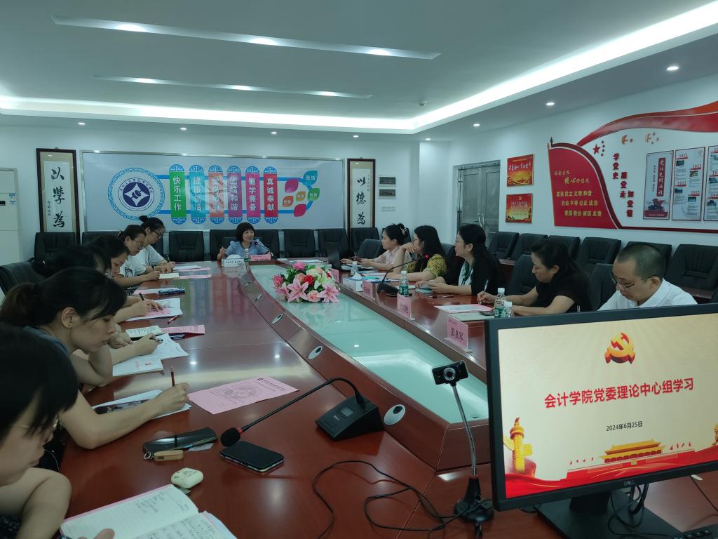 【本网讯】6月25日下午,会计学院党委召开党委理论学习中心组学习会,深入学习习近平总书记关于区域协调发展的重要论述。学校党委委员、副校长易露霞教授列席旁听。学院党委副书记、副院长全桂艳作领学报告,会计学院学生第五党支部书记张圣荧、学生第二党支部书记周金娣作交流发言。学院领导班子成员、党委委员、支部书记、支部宣传委员参会,会议由学院党委宣传委员刘帅飞主持。