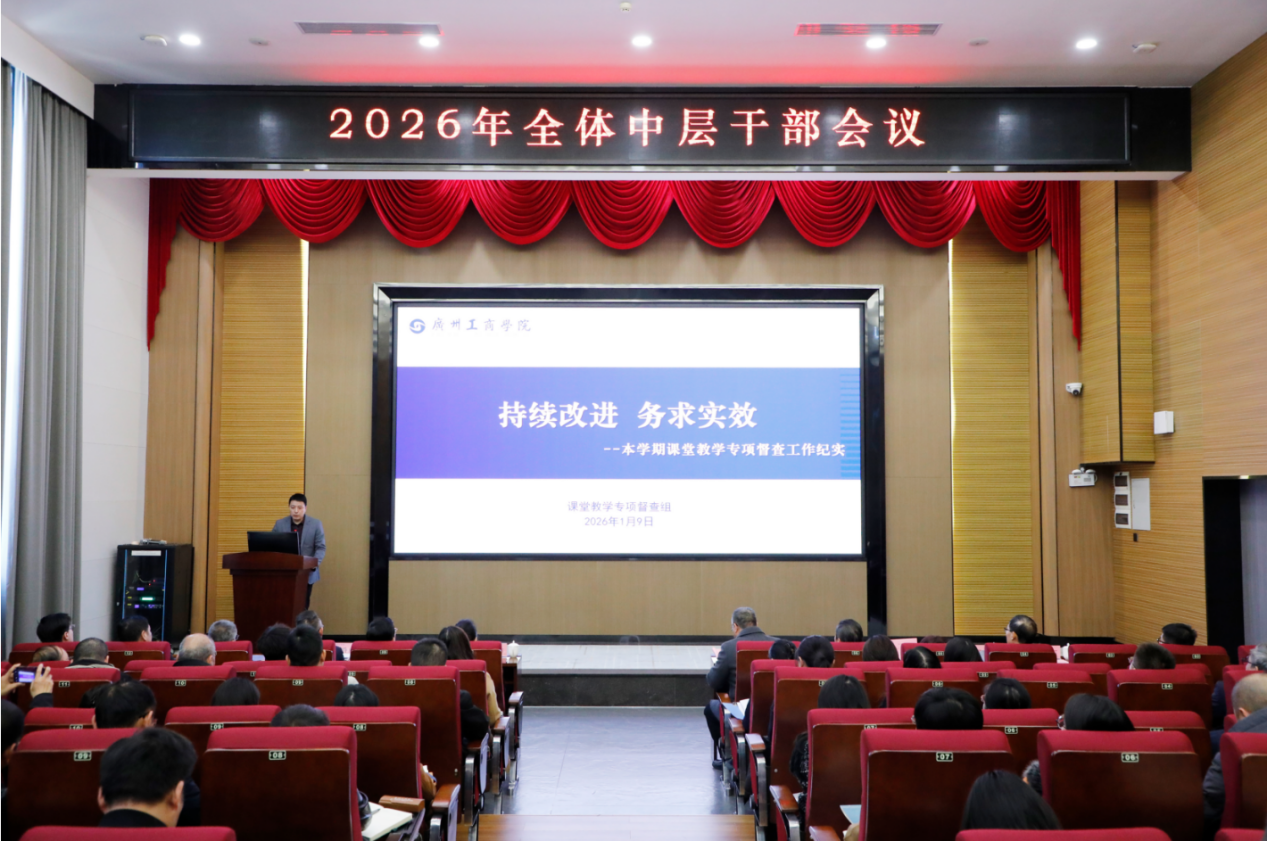 【本网讯】1月9日,学校在花都校区召开全体中层干部会议。学校领导及全体中层干部参会。会议全面回顾学校阶段性发展成果,深入分析当前形势,重点部署2026年核心工作任务,为学校高质量发展凝聚共识、擘画蓝图。会议由学校党委书记张振超主持。