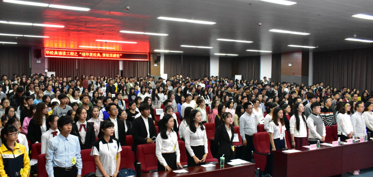【本网讯】为深入学习贯彻习近平总书记视察广东重要讲话精神和视察暨南大学关于传承传播中华文化重要指示精神,落实教育部和省教育厅关于开展中华经典诵读工程相关文件精神,引导广大师生认识传统、继承传统、弘扬传统,工商管理系党总支于11月27日晚上在三水校区举办了“诵华夏经典,赞祖国盛世”经典诵读大赛。党委副书记吴丽云同志,工商管理系、团委、创业培训学院相关负责人参加了本次活动,各院系党总支副书记、师生党员一同观看了比赛。