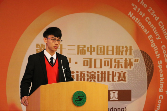 【本网讯】2017年12月23日下午,第二十三届中国日报社“21世纪·可口可乐杯”全国英语演讲比赛广东赛区决赛在中山大学南校区举行。在外语系副主任周燕老师的指导下、辅导员陈玲老师的带领下,外语系2016级商务英语专业朱金明同学在广东赛区选拔赛中表现优异,成功进入决赛,并在决赛中荣获二等奖。
