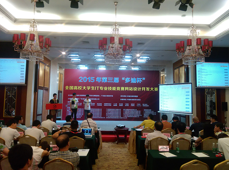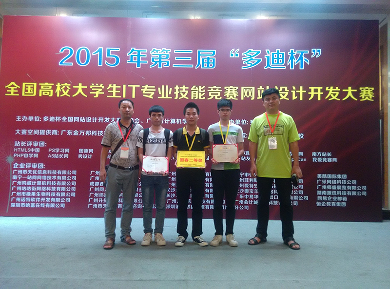 “多迪杯”全国大学生网站设计开发大赛是由多迪互联网集团、广东省计算机学会共同主办的一项面向中国在校学生的公益性赛事。2015年第三届多迪杯网站设计开发大赛共有68个学校参赛,参赛队数量为293队。经过激烈的网络投票评选,2015年5月23日,组委会严格按照大赛规则及参赛作品的得分情况,评选出121个优秀作品进入国赛第一阶段。我院共有三支队伍进入国赛,经过理论考试与技能考试,公开直播监考,评审专家的鉴定,我院一支队伍杀入全国总决赛。