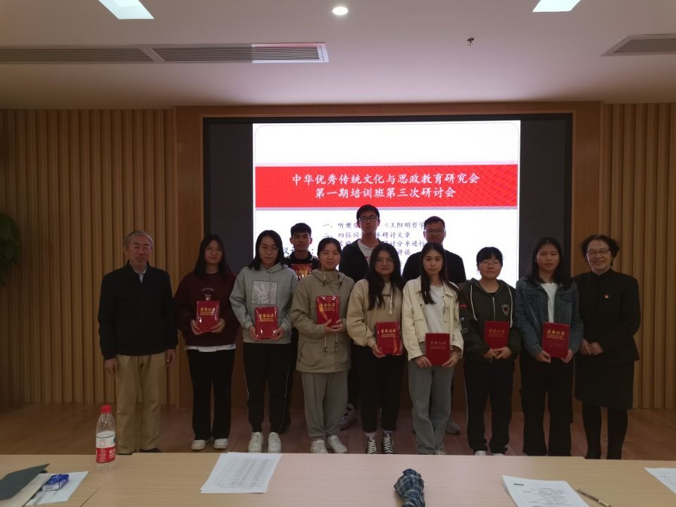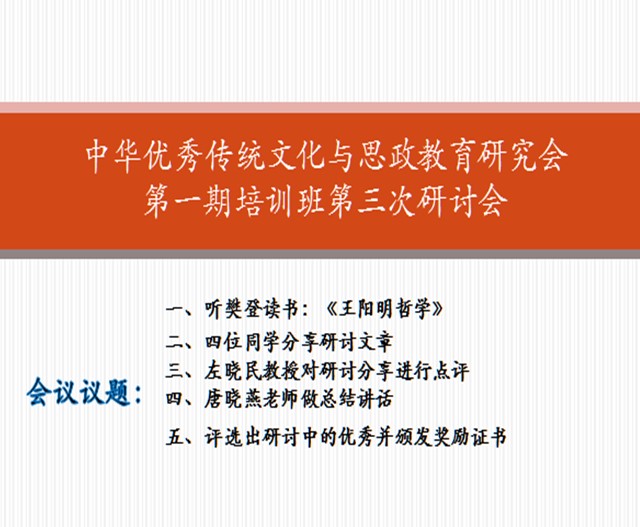 【本网讯】12月13日晚,马克思主义学院“中华优秀传统与思政教育研究会” 在新时代党员讲习所召开第一期培训班第三次研讨会暨结业总结会。马克思主义学院左晓民教授、唐晓燕副教授出席,研究会第一期培训班全体学员参会。唐晓燕副教授主持。