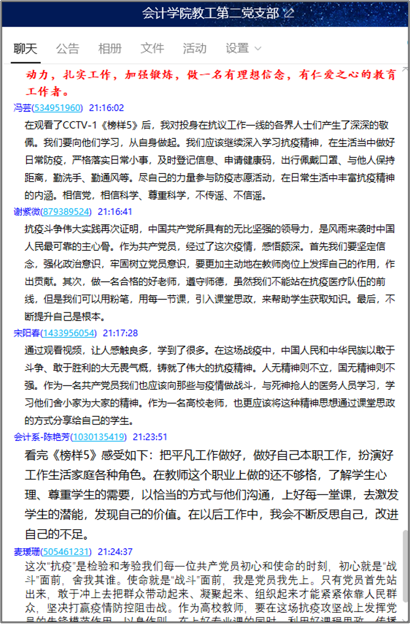 《榜样5》专题节目展现了积极投身疫情防控工作的共产党员不忘初心、牢记使命、敢于斗争、敢于胜利的大无畏气概,彰显了基层党组织战斗堡垒作用和党员先锋模范作用,诠释了生命至上、举国同心、舍生忘死、尊重科学、命运与共的伟大抗疫精神。针对观看《榜样5》的节目内容,同志们进行了热烈的网络讨论。教工第二支部的老师们表示,作为高校老师,要以身作责,书写正能量,忠于党的教育事业,立足本职工作,出色完成学校的教学任务与推进学校的教学改革,在课堂中服务好学生,在课堂外作学生的榜样。(会计学院党总支)