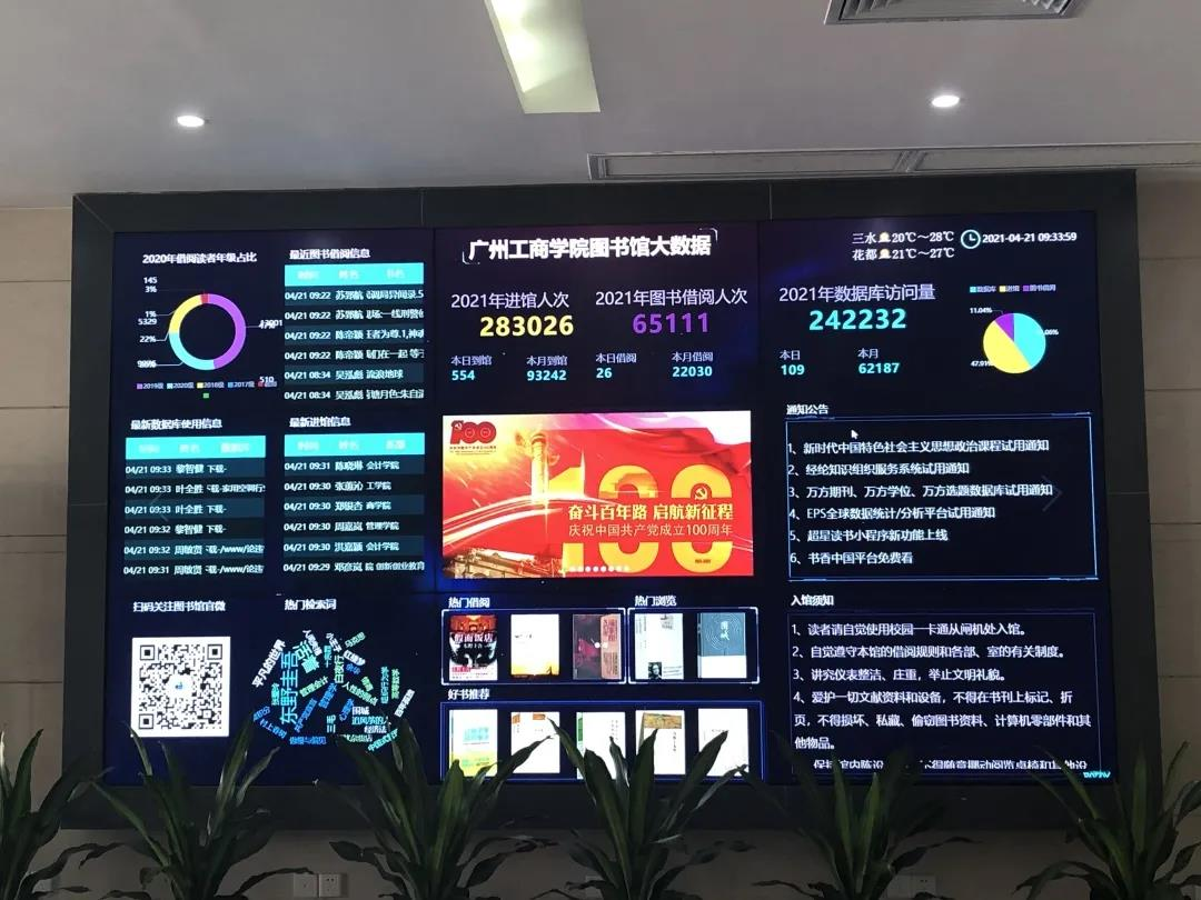 一、开设“党史国史国情”音视频展播,饮水不忘挖井人,喝水不忘学党史。为了更好配合党史学习教育宣传,图书馆充分发挥三水校区图书馆大数据显示屏和各楼层饮水机自带显示屏的多媒体播放优势,安插党史图片和视频展播。大数据屏位于图书馆大厅,为读者进馆必经之路,图书馆利用此设备,精选一定数量的建党百年庆祝宣传图片循环显示,学生一进馆就可以接受党史学习教育。三水校区图书馆各楼层的纯净水饮水机均配置有媒体显示屏,可以播放视频和图片资料,这是很好的一个宣传途径。图书馆利用资源优势,从党史学习教育官网精心挑选了《百炼成钢:中国共产党的100年》系列宣传短片进行视频循环播放,激励和引导学生学习党史!