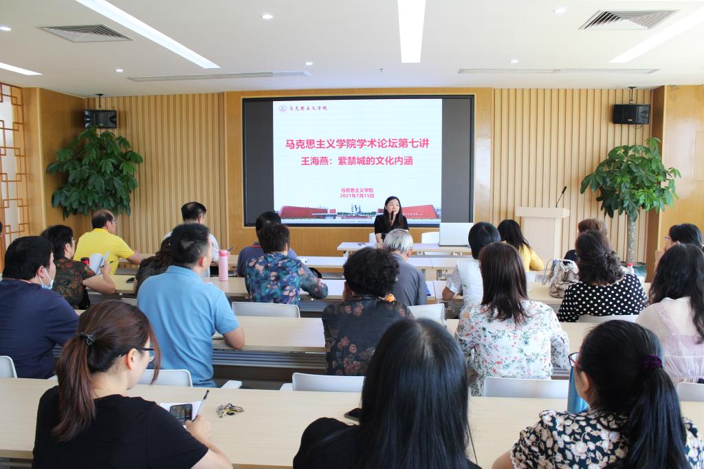 王海燕教授以《中国抗疫中的文化自信:以紫禁城“整体思维”内涵为例的分析》为题,从“天人合一的整体思维”“择中为尊的营国思想”“师法自然的堪舆观念”“趋吉避凶的方位观念”“崇尚和谐的理想观念”“重内轻外的内轻思想”“尊卑有序的礼制观念”“壮丽重威的审美思想”共8个方面予以展开。王教授谈到,从故宫的华表、双阙、石狮等专门礼制性建筑,到乾清宫、太和殿等标志性建筑,故宫大大小小90多座庭院建筑群,无不彰显着中国人含蓄内省的性格和中华民族文明文化的和谐统一。