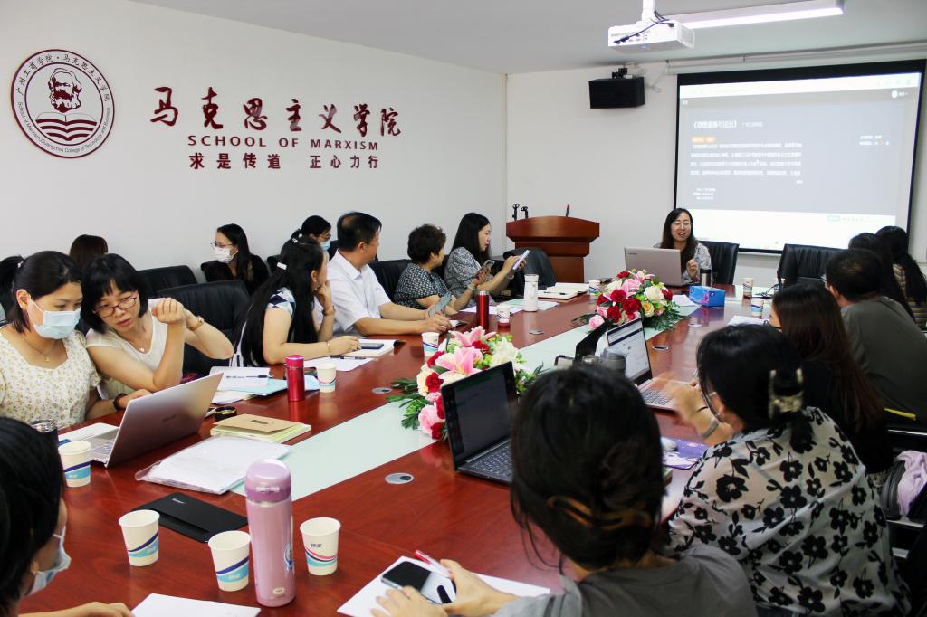 最后,项目组成员彭艺格老师详细讲解了《思想道德与法治》在线开放课程考核标准,她展示了考核标准的内容构成,并结合签到操作流程应用案例,对在实际应用中可能会出现的问题进行讨论和答疑。该考核标准符合《广东省本科高校在线开放课程建设上线标准(试行)》文件要求。