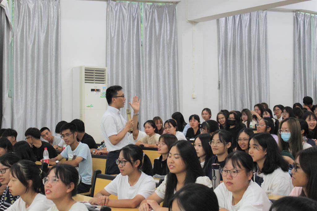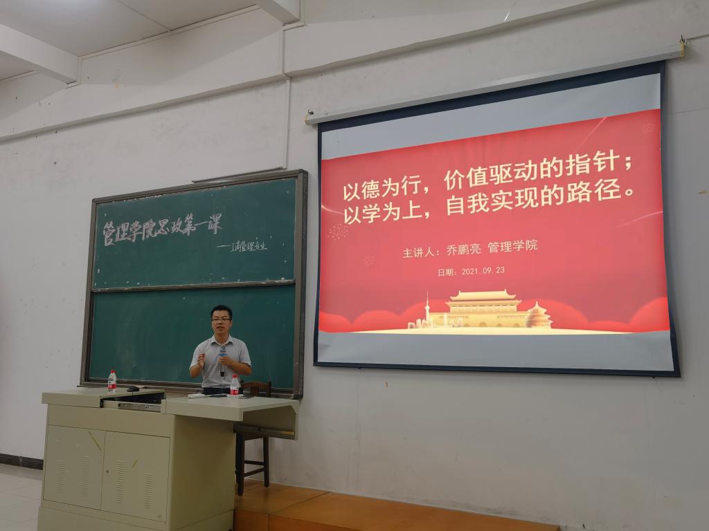 【本网讯】为深入贯彻《beat365在线体育官网登录入口2021年秋季学期高校党委书记、校长和院党组织书记、院长上第一堂思想政治理论课活动方案》通知精神,加强对2021级新生的党史学习教育与培养,引导广大新生积极践行“德学·五进”教育实践活动,管理学院于9月23日在第一教学楼和第二实验楼开展思政第一课活动。主讲人为管理学院党总支书记、院长乔鹏亮和常务副书记、副院长邹剑峰。