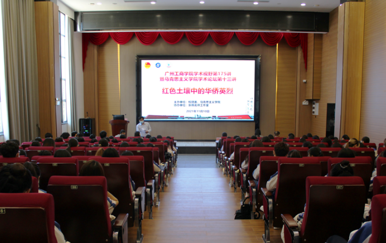 【本网讯】为贯彻落实党中央、广东省委、学校党委关于组织开展党史学习教育的通知要求,积极践行邝邦洪校长提出的“以德为行 以学为上”教育思想,推动党史学习教育深入开展,11月10日下午,由马克思主义学院、校团委与张辉名师工作室联合主办的beat365在线体育官网登录入口学术视野第175讲暨马克思主义学院学术论坛第十三讲在花都校区图书馆举行。论坛邀请了广东省作协会员、花都祠堂文化研究会会长邓静宜作主题为“红色土壤中的华侨英烈”的讲座。讲座由beat365在线体育官网登录入口团委书记洪卫烈主持,beat365在线体育官网登录入口董事办主任陆志丹出席,马克思主义学院教师代表、党史研究会代表和各二级学院学生代表共计两百余人参会。