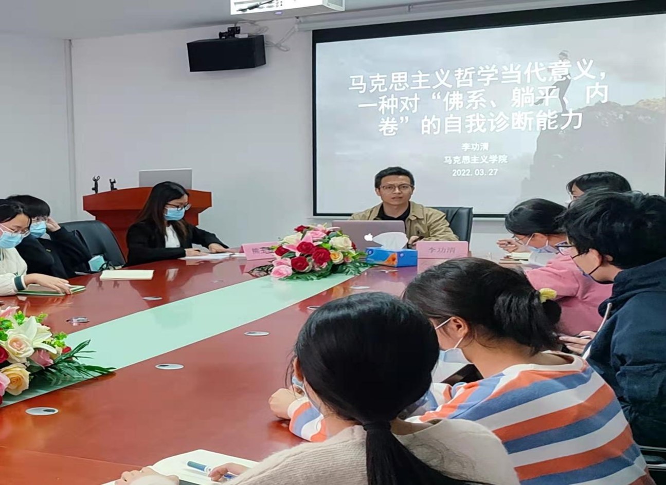 【本网讯】为进一步加强青年大学生思想文化建设,传承经典著作、弘扬传统文化,3月27日晚,马克思主义学院大学生马克思主义理论研究读书协会在三水校区举办主题为“马克思主义哲学当代意义:一种对‘佛系、躺平、内卷’的自我诊断能力”的读书会活动。活动由马院李功清老师主持,马院“概论课”教研室主任熊玉琴老师及读书会成员参加。