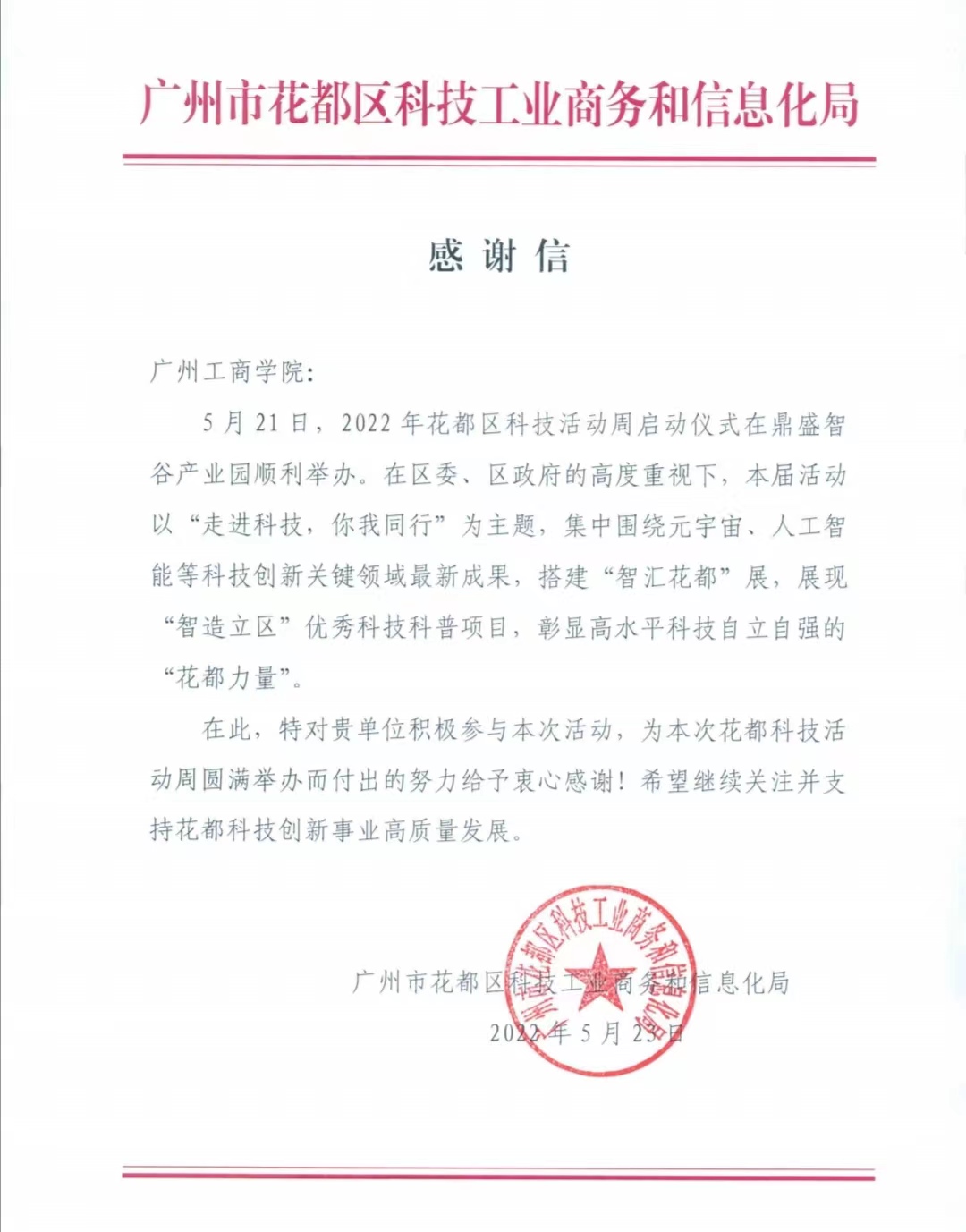 花都区科技工业商务和信息化局感谢信