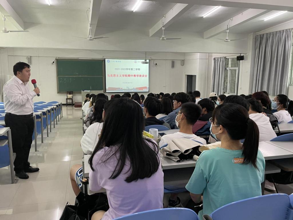 【本网讯】为深入了解本学期思政课开设情况,推进思政课教育教学改革,进一步提升马院教学质量与水平,5月19日下午,马克思主义学院在三水校区召开2021-2022学年度第二学期三水校区学生座谈会。马学院概论课教研室主任熊玉琴老师、青年教师代表张赫老师和60多名学生代表参加座谈交流。