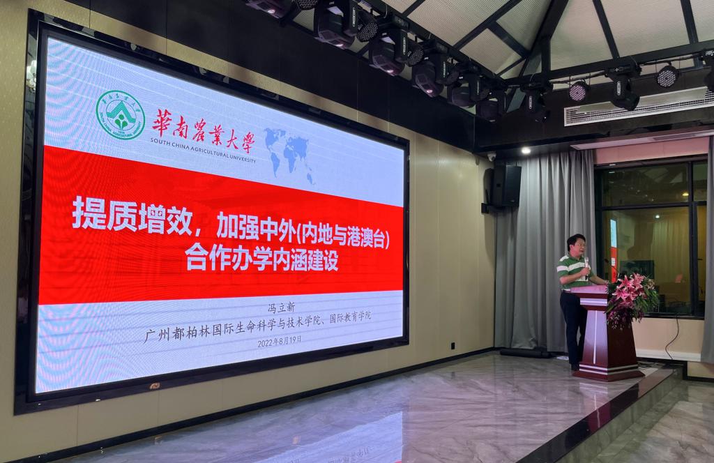 19日下午,华南农业大学广州都柏林国际生命科学与技术学院、国际教育学院院长冯立新“以提质增效,加强中外(内地与港澳台)合作办学内涵建设”为题,结合多年中外合作办学管理经验和评估评审工作经验,详细介绍了中外合作办学评估的各方面内容。冯立新院长着重从中外合作办学中双重属性与双向驱动、全面发展与示范引领、规模扩大与质量提升、双方资源与融合创新、内涵发展与安全稳定以及对口管理与协同发展等方面对我院国际教育给出了指导性意见,提出积极引进国外优质教育资源,强化中外、内地与港澳台合作办学内涵建设,提质增效,以促进我院国际教育教学改革和办学理念、办学机制的创新。