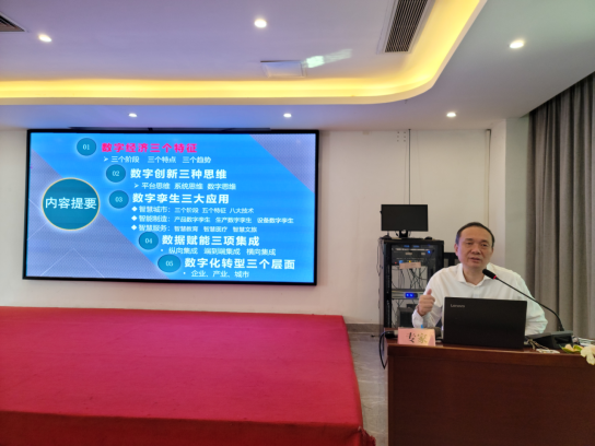 张振刚教授以《结构化思维与表达》为主题,用生动形象的具体事例简述了什么是结构化思维,然后环环相扣引出了进行结构化思维的四大原因。他认为,进行结构化思维,一是能够在阅读和倾听的过程中,快速获取信息,把握要点重点观点;二是能够快速制定并撰写工作报告,并且条理清晰,重点突出;三是能够在现场即兴讲话中准确获取信息,迅速归纳总结,形成概念框架。四是能够有条不絮地在纷繁的市场竞争中分析复杂问题,理清工作思路,把握重点难点,提出解决方案。最后,张教授强调结构化思维要注意“结构化、简明化、完整化、形象化、准确化”五个原则。接着,张振刚教授将结构化思维与表达的方法应用到《数据赋能企业创新发展》的讲授中,详细地阐述了“数字经济三个特征、数字创新三种思维、数字孪生三大应用、数据赋能三项集成、数字化转型三个层面”。