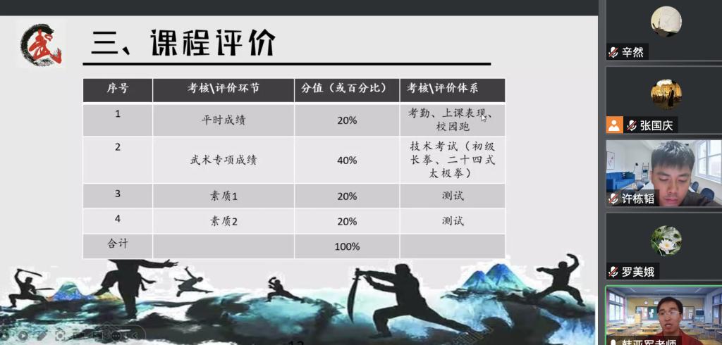 【本网讯】为落实立德树人根本任务,充分发挥教学竞赛在教师队伍素质建设中的引领作用,促进教师教学技艺交流切磋,根据学校首届教师综合教学大赛的部署安排,10月20日下午,体育部通过腾讯会议的方式举行了初赛,初赛包括课程说课和课堂教学两大部分。本次比赛由体育部主任刘嘉丽教授主持,体育部高职称教师和教研室主任担任评委,共7位教师参加了本次比赛,全体教师参与了听课活动,最后由体育部兼职督导彭文革教授对比赛进行了点评。
