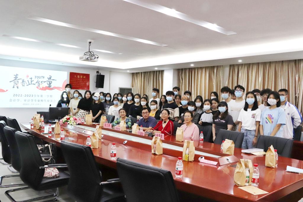【本网讯】11月11日下午,会计学院会计学教研室在院部楼举办2022-2023学年第一学期会计学专业师生座谈会。会议深入贯彻会计学院“我为师生办实事”的工作举措,面对面倾听了学生心声,了解学生需求,及时解决学生问题。会计学院院长任道纹博士、副院长周福萍副教授、质评中心高荣发教授、吴兰萍教授、张秀霞教授、会计学教研室主任邓晔莹以及部分师生代表出席座谈会。会议由会计学院教研室副主任刘炎旭老师主持。