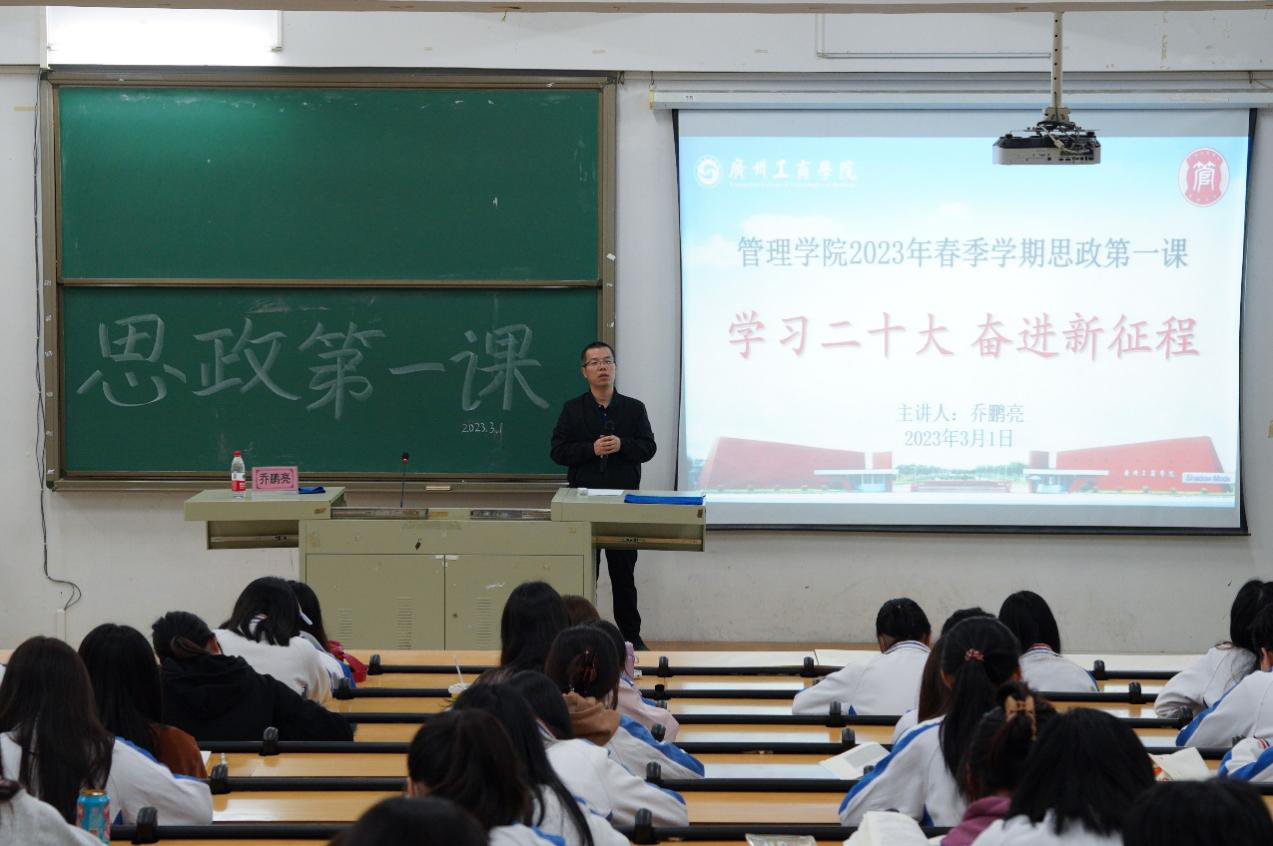 【本网讯】为深入学习贯彻党的二十大精神,切实引导我院学子深刻领会、准确把握党的二十大精神的实质和丰富内涵,3月1日晚上,管理学院党委书记、院长乔鹏亮在三水校区开讲2023年春季“思政第一课”。