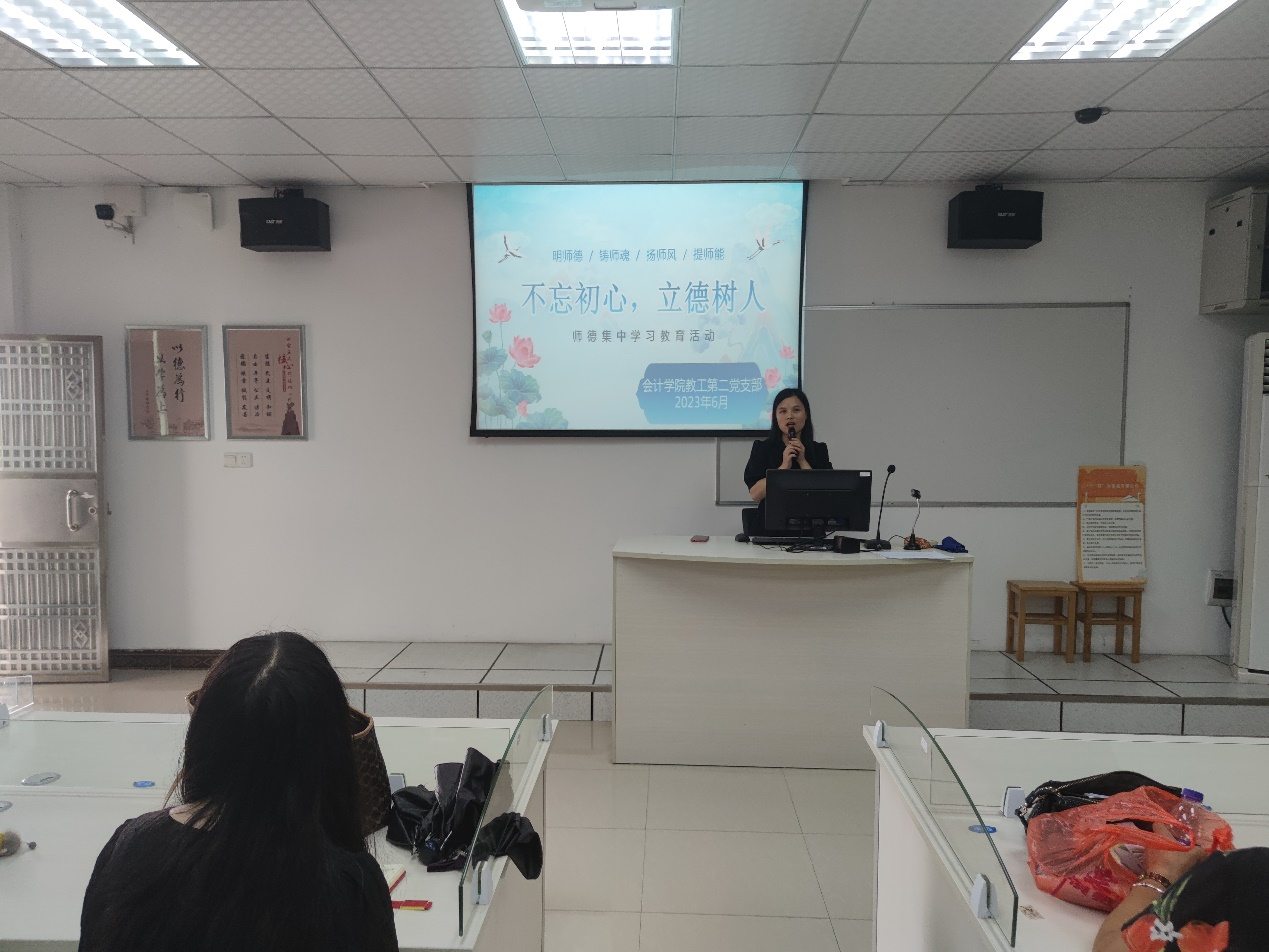 利雅从师德的要义、内涵、核心与最高境界四个方面,对大家开展师德教育。她表示,希望老师们能够“坚守三尺讲台,潜心立德树人”,遵守“新时代高校教师职业行为十项准则”,做到“以德修身,恪守师德;以德修己,弘扬师德;以德育人,桃李芬芳”。作为一名光荣的人民教师,我们应该“明师德,铸师魂,扬师风,提师能”,坚定理想信念,涵养高尚师德,争做“四有好老师”的示范标杆,成为践行高尚师德的中坚力量,用热心给予学生勇气,用爱心激励学生进取,用耐心帮助学生成才。