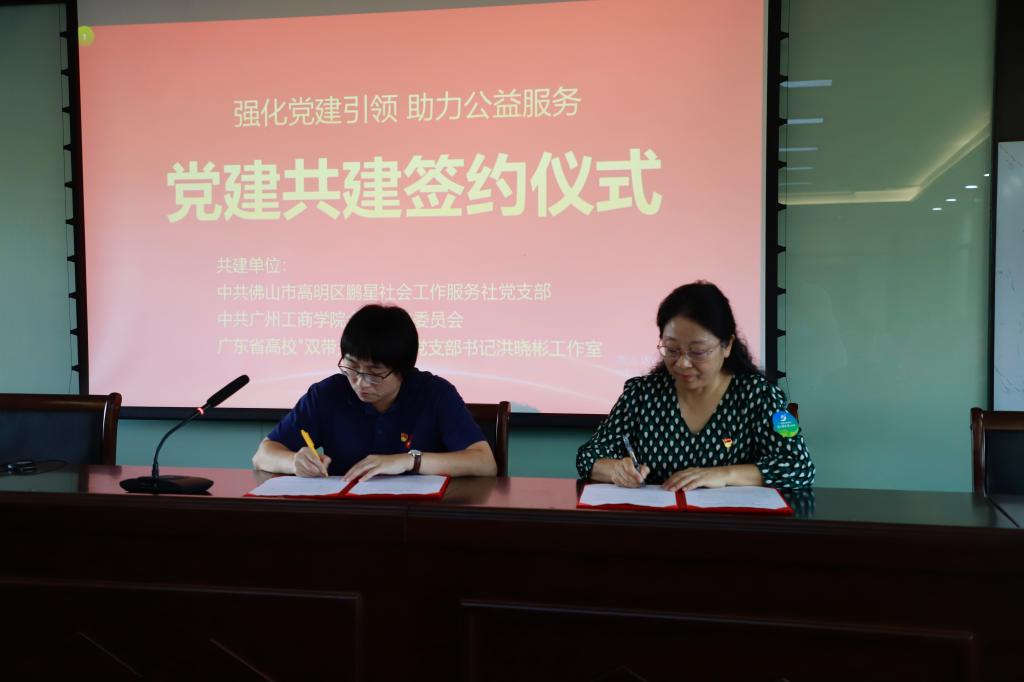 【本网讯】7月13日下午,中共beat365在线体育官网登录入口会计学院委员会和广东省高校“双带头人”教师党支部书记洪晓彬工作室与佛山市高明区鹏星社会工作服务社党建共建单位签约仪式在中共佛山市高明区委党校隆重举行。会计学院党委书记、院长任道纹,党委副书记、副院长全桂艳,学校党委办公室主任科员何艳娴,佛山市高明区鹏星社会工作服务社副总干事邱淑珊出席签约仪式。签约仪式由鹏星社会工作服务社严子媚主持。