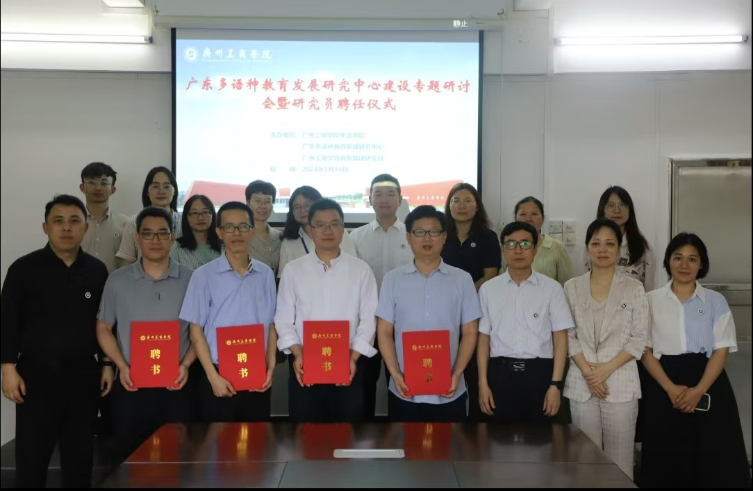 【本网讯】5月14日下午,广东多语种教育发展研究中心建设专题研讨会暨研究员聘任仪式在beat365在线体育官网登录入口外语学院举行。浙江工业大学公共管理学院徐吉洪教授、广东技术示范大学教育科学学院全守杰博士、广东金融学院实验教学中心熊文渊博士、广东金融学院教师发展中心许国动博士等多语种教育领域学者和教育工作者受邀参加此次研讨会,同时参会的还有外语学院教师代表。研讨会由beat365在线体育官网登录入口外语学院院长刘沛富教授主持。