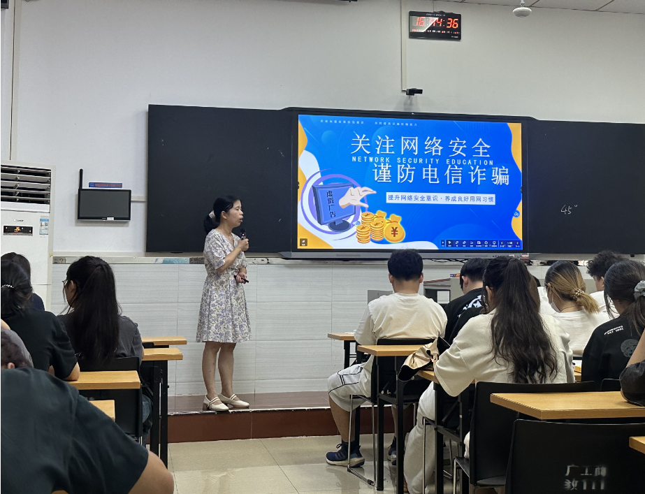 辅导员张圣莹向同学们强调电信网络防诈骗的重要性。她向同学们展示了网络防诈骗宣传片,普及了一些常见的诈骗手段。她提醒大家,大学是一个全新的阶段,大多数新生会对各种各样的新事物产生好奇和兴趣,希望新生们在尝试新事物、挑战未知、发掘自身的兴趣和潜能的同时,能具备较强的反诈意识,保护自身利益安全。