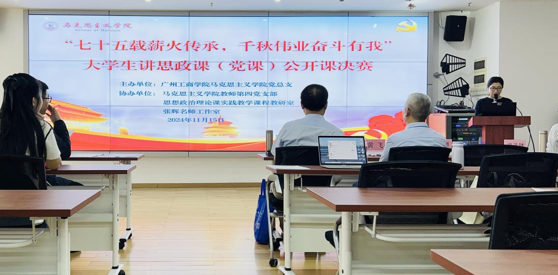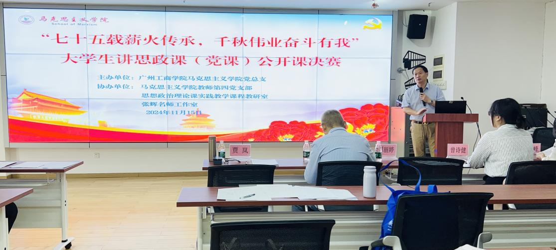 赛前,同学们积极报名和组队,认真创作与拍摄视频,经过初赛筛选,共有8份作品被推送到省教育厅进行评比。11月15日下午,本次大学生讲思政课(党课)公开课现场决赛在三水校区进行。马克思主义学院副院长黄飞、院长助理谭丽婷等相关负责人参加。马院教师第四党支部书记曾诗健副教授、贾岚教授、张松峰老师作为评委。