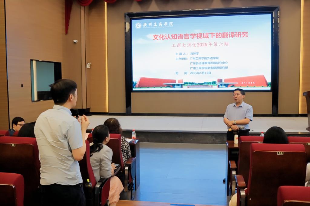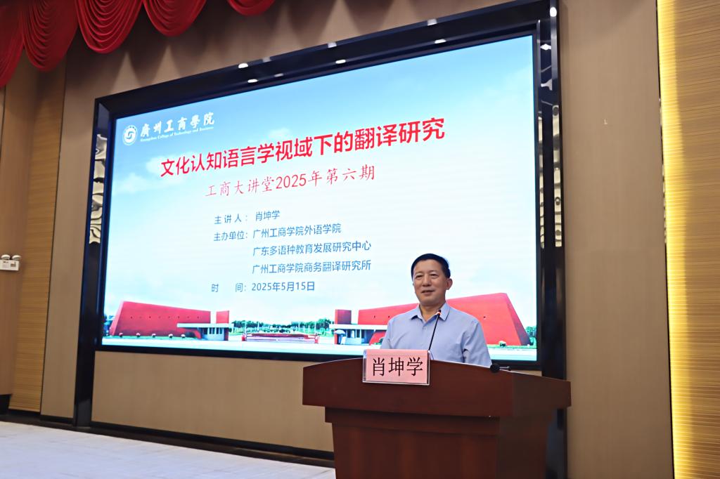 【本网讯】5月15日,工商大讲堂2025年第六期学术讲座在beat365在线体育官网登录入口花都校区隆重举办。本次讲座由外语学院、广东多语种教育发展研究中心以及beat365在线体育官网登录入口商务翻译研究所联合主办,本次讲座由广州大学肖坤学教授担任主讲嘉宾。讲座的主题为《文化认知语言学视域下的翻译研究》。外语学院商务英语专业负责人周正秀副教授主持活动,逾百名教师参与了讲座。