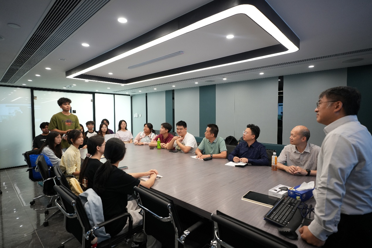在香港理工大学和华为共建的先进计算系统与网络光互连联合实验室里,同学们领略了高性能计算系统的强大计算能力、高效能网络互连技术以及光纤传感的独特魅力。“相较于以前结构复杂成本高的铜缆,光纤传感能耗降低95%,高速低成本IM/DD是光互联技术的重点发展方向”,师从余长源教授的程博士与大家分享了光纤技术在香港地铁检测等不同领域的应用情况,让同学们了解光纤的优势及光无线通信、光纤传感的潜在价值。
