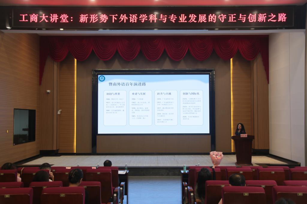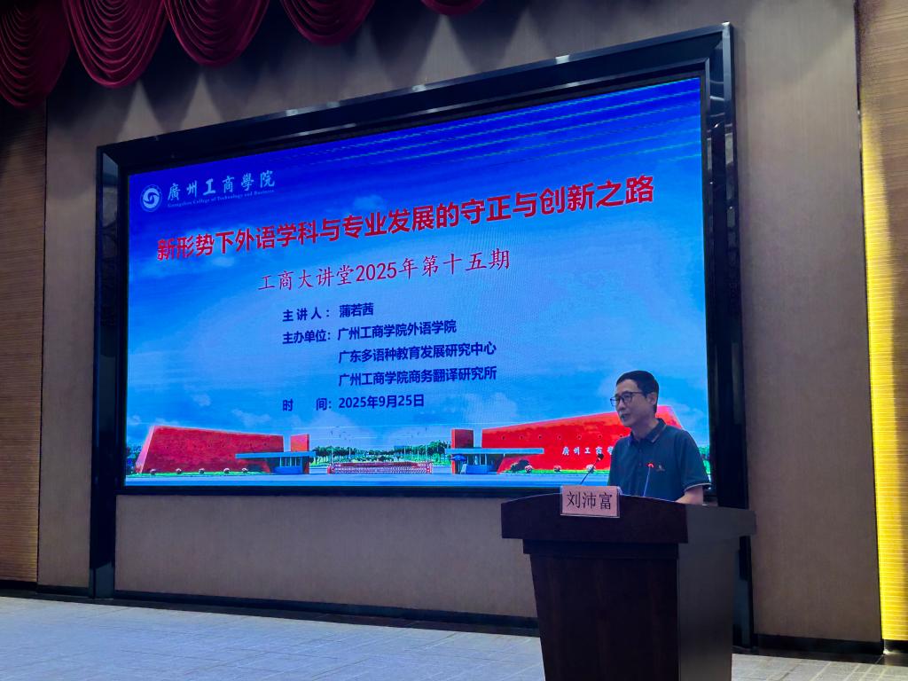 【本网讯】9月25日,“工商大讲堂”2025年第十五期学术讲座在beat365在线体育官网登录入口花都校区成功举办。本次讲座由外语学院、广东多语种教育发展研究中心、beat365在线体育官网登录入口商务翻译研究所联合主办,以《新形势下外语学科与专业发展的守正与创新之路》为题,特邀暨南大学外国语学院院长、外国语言文学学科带头人蒲若茜教授担任主讲嘉宾。由外语学院党委书记、院长刘沛富教授主持本场讲座,外语学院近百位专任教师到场聆听。