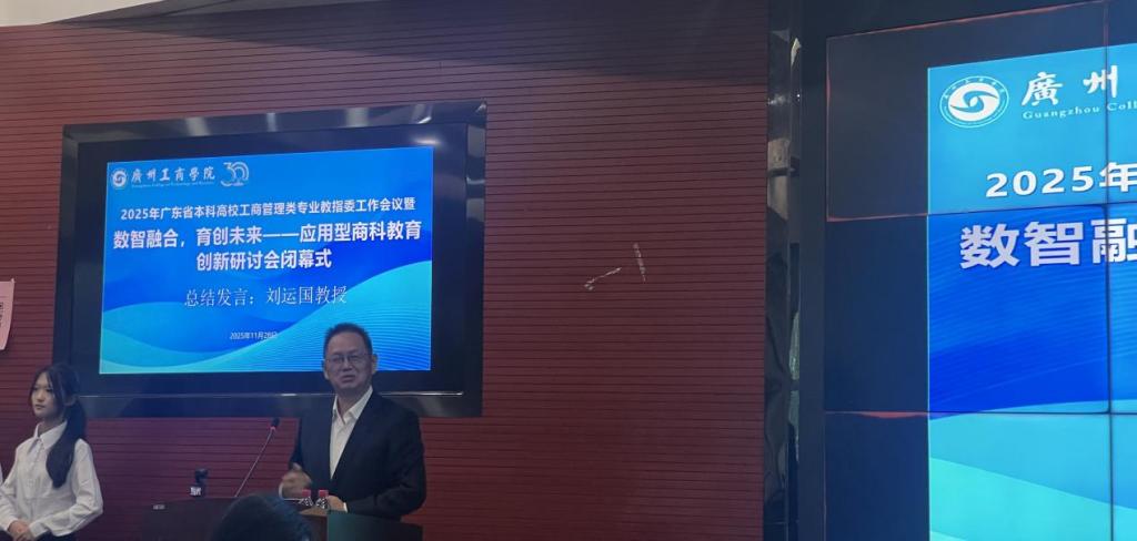 闭幕环节,广东省本科高校工商管理类专业教指委代表、中山大学刘运国教授作总结发言。刘运国教授深刻指出,本次研讨会不仅是经验的交流,更是方向的共识与行动的发端。当前商科教育正面临前所未有的变革压力与发展机遇。“数字技术不是选修题,而是必答题;不是辅助手段,而是核心能力。”他强调,商科教育必须从理念、体系、方法三个层面实现系统性重构,构建以学生发展为中心、数字能力为基座、产教融合为路径的新型培养体系。他提出三大行动倡议:一是坚守育人本质,构建以学生发展为中心、数字能力为基座的新型培养体系;二是强化协同创新,建立“高校——企业——出版——认证”四位一体的合作机制,共建资源平台、共研教学标准、共评培养质量;三是发挥教指委引领作用,打造粤港澳大湾区商科教育创新共同体,推动形成开放共生、持续演进的商科教育新生态。