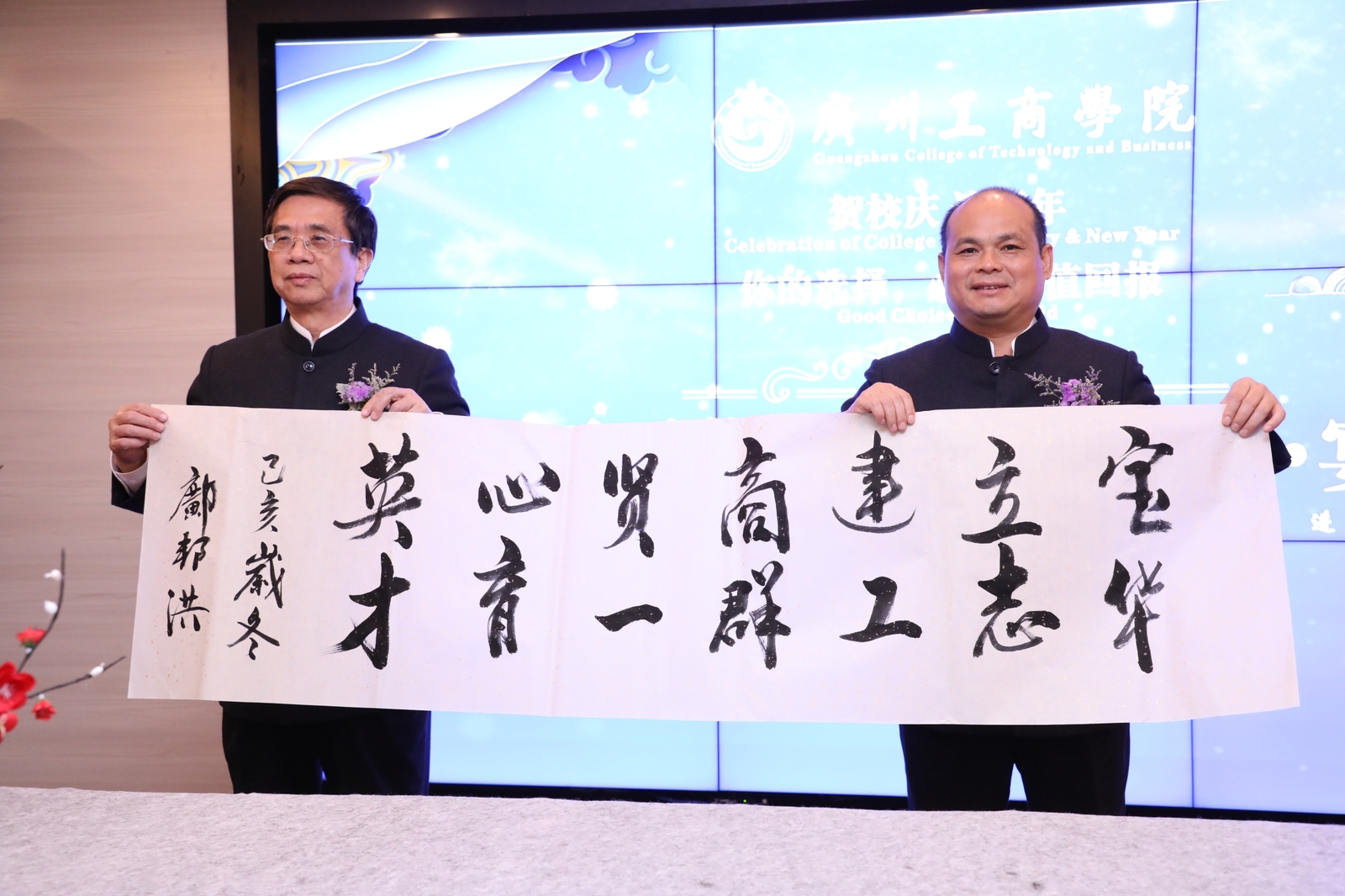 双龙戏珠贺新年,舞龙点睛共团圆。1日1日上午,舞龙点睛仪式在学院三水校区厚德广场举行。伴随着锣鼓声响,两条长约十米的金龙蜿蜒舞动而至,学院院长邝邦洪、党委书记张振超分别手握毛笔,为龙眼点上神采奕奕的一笔。学院领导班子成员、教学单位负责人及职能部门负责人等共同见证了这振奋人心的一幕。仪式结束后,校友们与学院师生们共同合影留念。