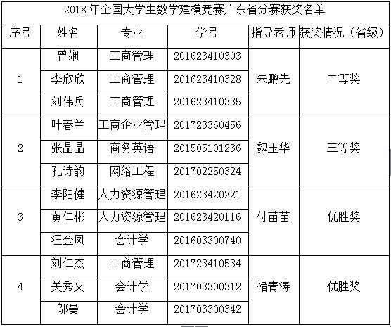 【本网讯】11月中旬,由中国工业与应用数学学会、广东省教育厅共同主办的2018年全国大学生数学建模竞赛广东省分赛获奖结果揭晓,我院4支队伍分别荣获省二等奖1项,省三等奖1项,优胜奖2项的佳绩。获奖学生人数占学院总参赛人数的40%。此外,在中国数学会和广东省数学会共同主办的2018年全国大学生数学竞赛广东省分赛中,我院参赛学生获得非数学专业组(民办及高职高专类)广东省一等奖1项,二等奖3项,三等奖4项。